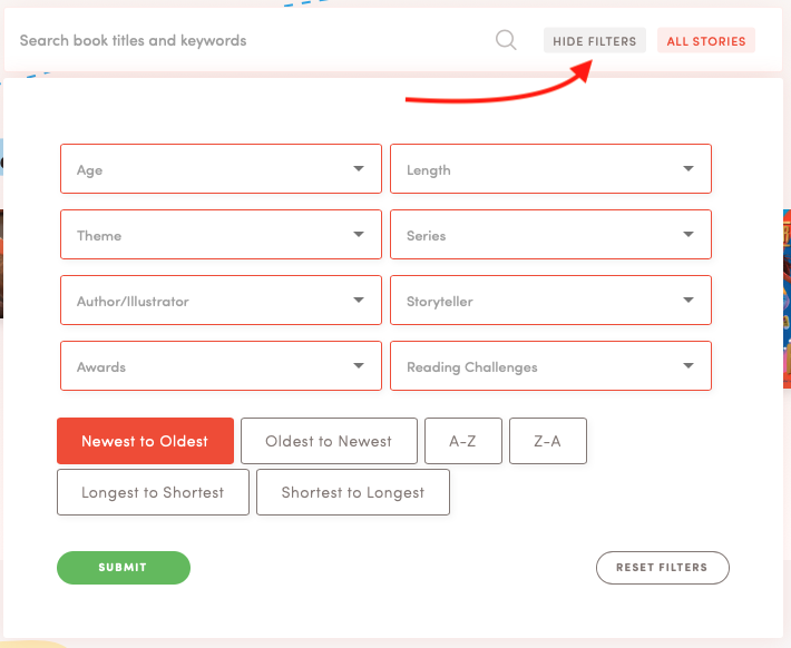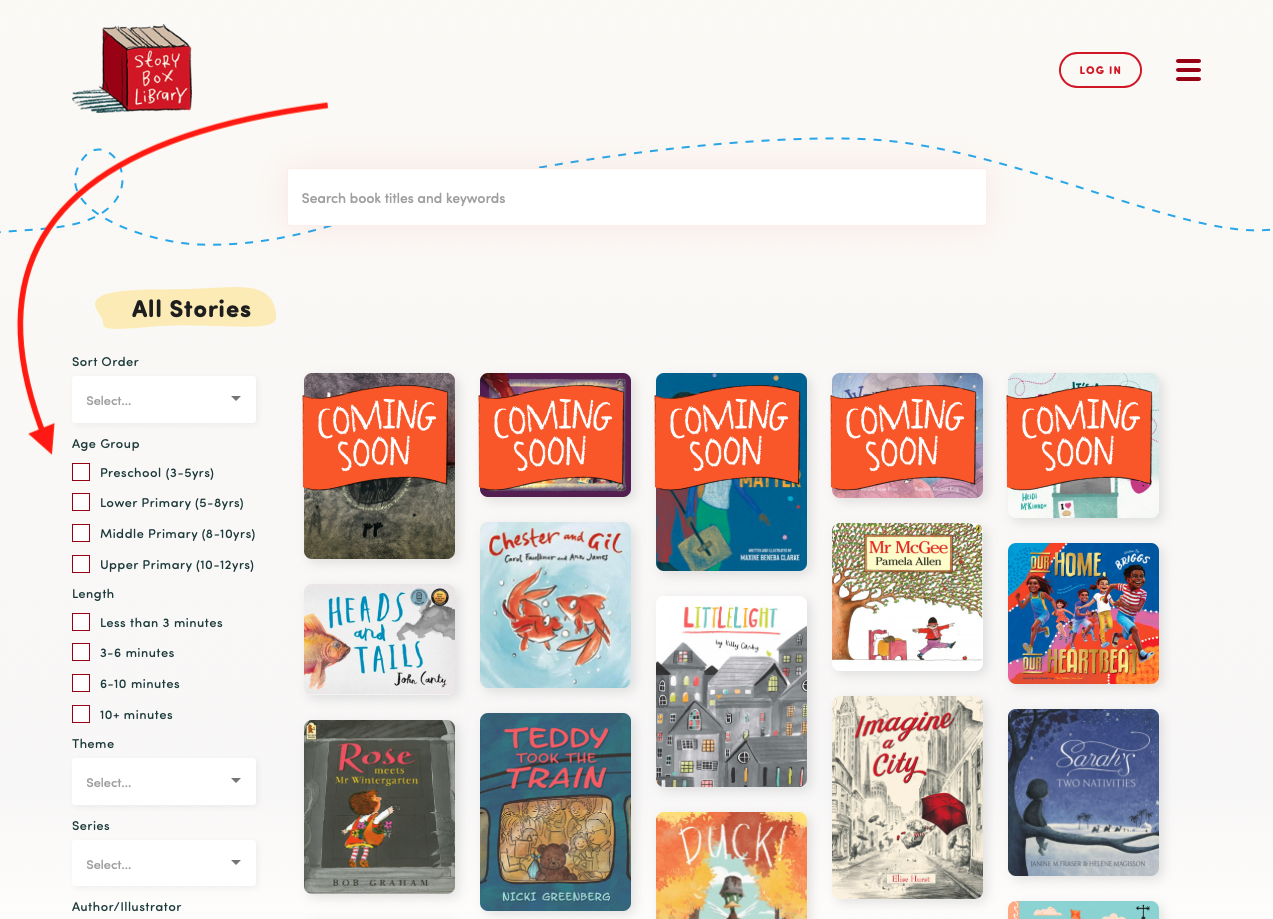 - On the Stories page side, use the the options down the left hand side of the page to filter videos by age, duration, theme, author, illustrator, storyteller and more: